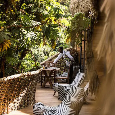 Villas echo Rwandan royal architecture and include views of Mutanda, Bisoke, and Karisimbi volcanoes. Guests trek with expert rangers in small groups to mountain gorillas and golden monkeys. On-site activities include bird-watching, nature walks, and optional volcano hikes. Guests may plant native trees in a reforestation program restoring over 90,000 saplings.